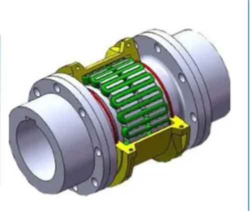 (2)撓性聯(lián)軸器:又分為齒套式和蛇形彈簧式兩種。齒套式聯(lián)軸器用套微的內齒分別與兩個齒輪嚙合,使兩個轉子聯(lián)接起來。它的優(yōu)點是有一定的活動性,可以消除和減弱振動的傳遞,對轉子中心要求不很高,不傳遞軸位移,但必須在運轉時通入潤滑劑,檢修和安裝要求質量高。蛇形彈簧管聯(lián)軸器是在兩個被連接的對輪的外緣銑出的類似漸開線的牙齒上,沿園周嵌入若干彈性剛帶制成的蛇形彈簧,把兩個對輪聯(lián)接起來。優(yōu)點是:能避免傳遞振動,又允許轉子有較大的中心偏差和軸向位移。但結構復雜、傳遞力矩小,運行中需要潤滑。